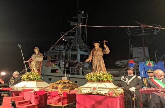 7 PM – SOLEMN SEA PROCESSION with the relics and statues of the patron saints, from the tourist harbor to the inner harbor, with landing at the quay in front of the Virgilio staircase – TV broadcast live on Antenna Sud. Speeches by the ARCHBISHOP and the MAYOR, the handing over of the keys of the city, and the raising of the Flag of Peace.
